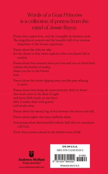 A moving poetic debut from a talented artist, USA TODAY bestseller Words of a Goat Princess is everything you love about singer/songwriter Jessie Reyez—her rawness, her love affair with the ugly truths of humanity, and so much more.